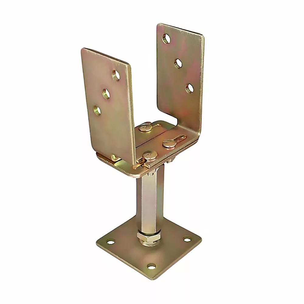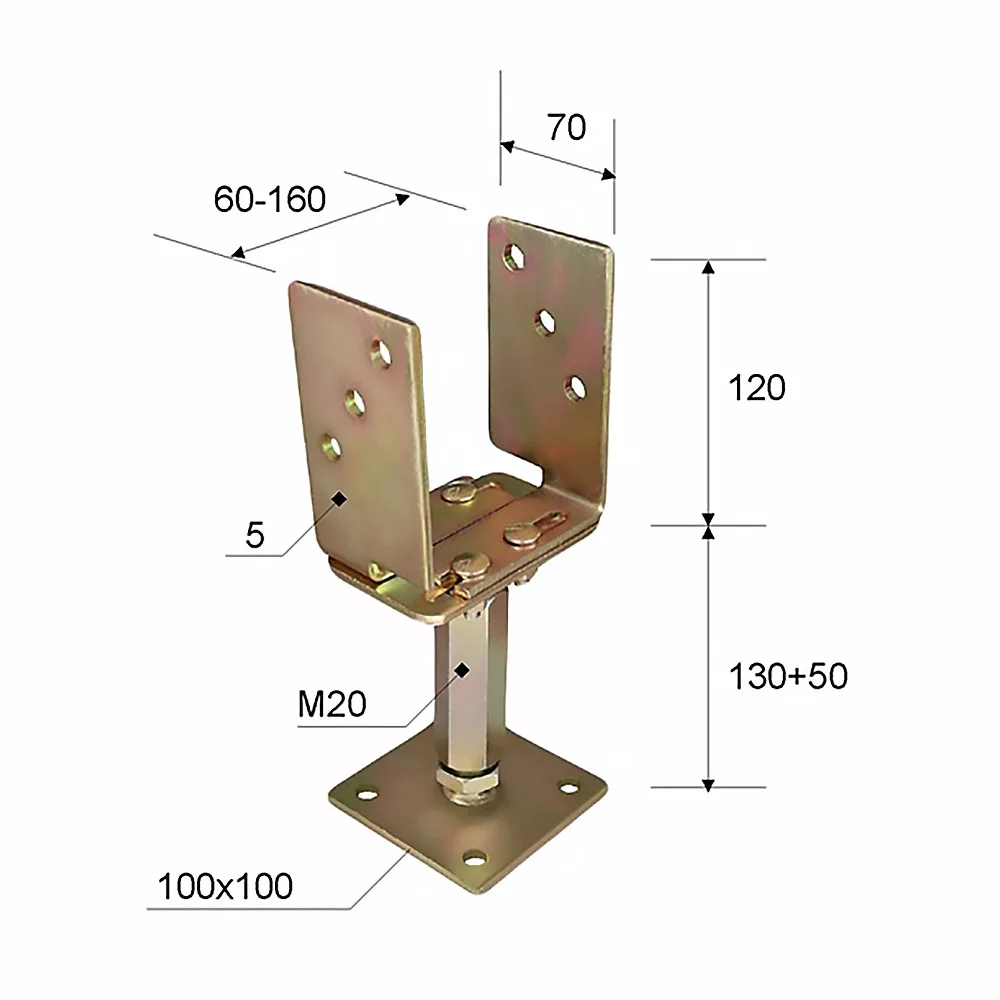 Állítható szélességű és magasságú lefúrható talpas oszloptalpKengyel szélesség: 60-160 mmSárgára horganyzott felületAlaplemez: 100x100 mmSzár: M20x130-180 mmLemezvastagság: 5 mm