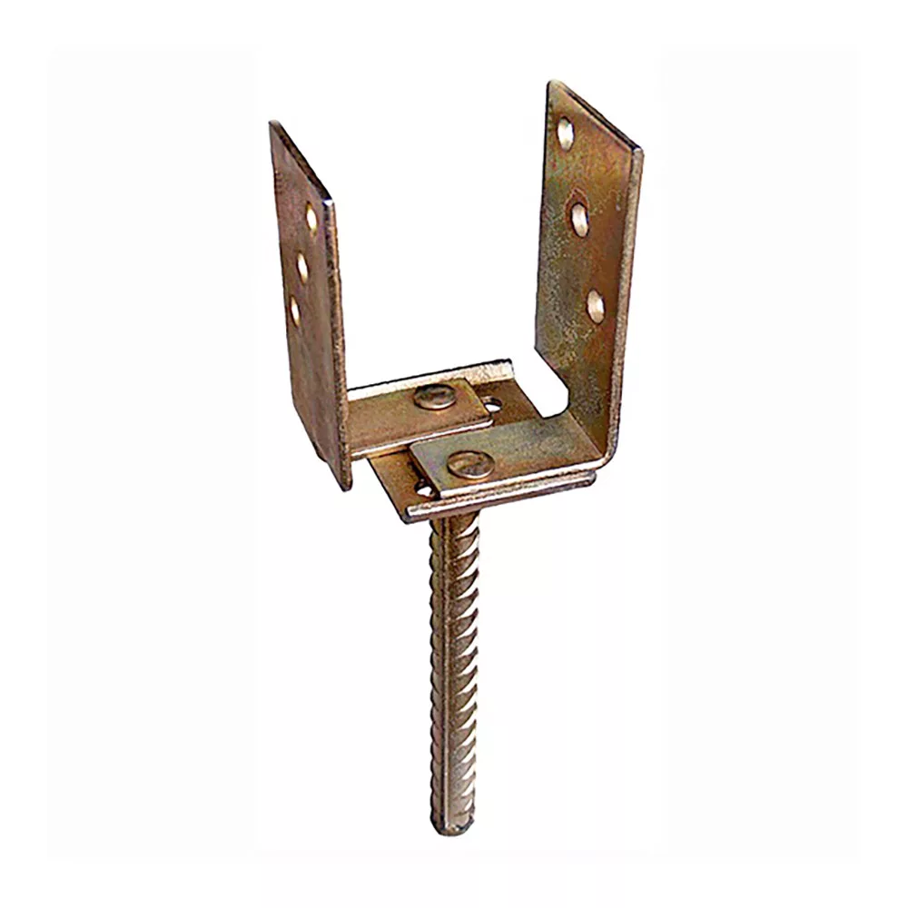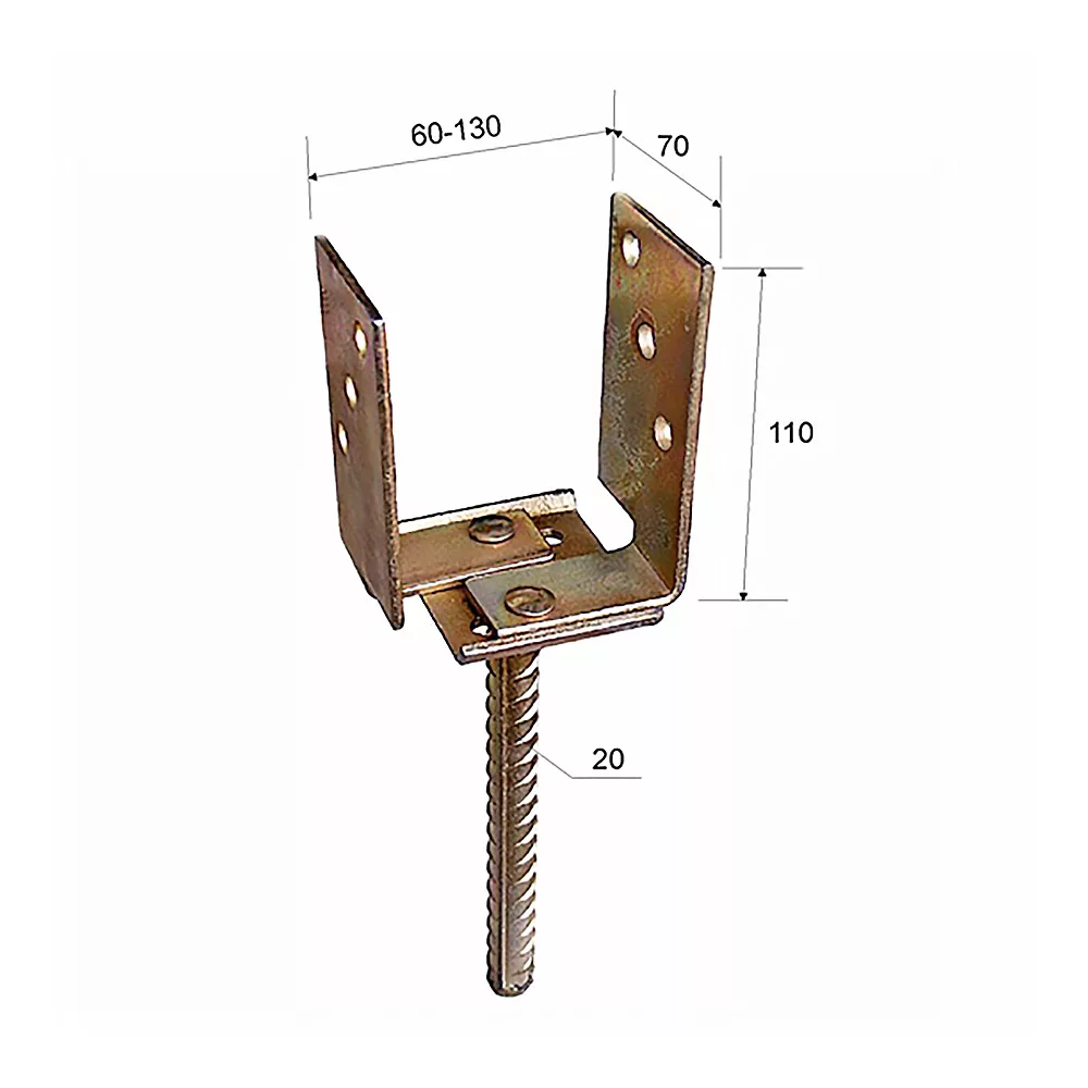 Állítható szélességű oszloptalp, betonozhatóKengyel szélesség: 60-130 mmSárgára horganyzott felületBetonozható szár: ∅20x200 mmLemezvastagság: 5 mm