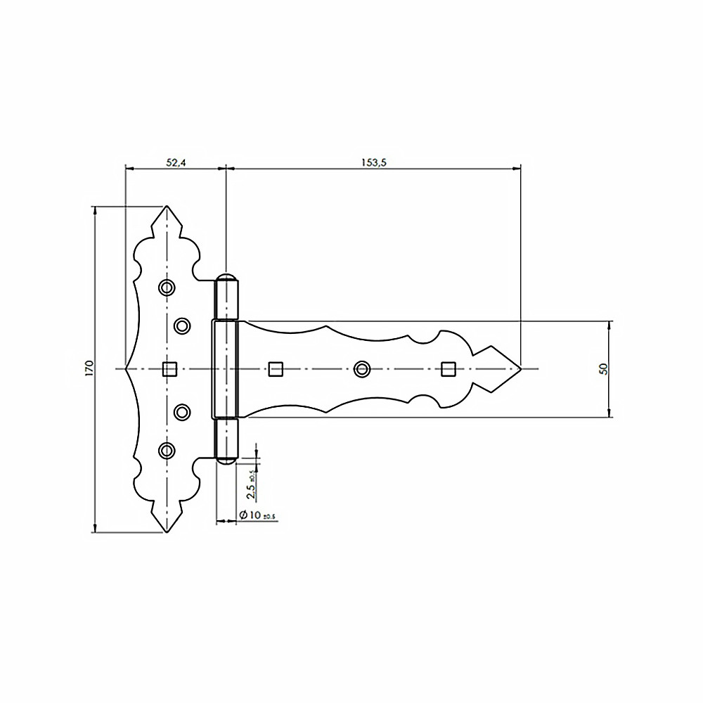 Alaplemez szélesség: 52 mmPánt szélesség: 153 mmAlaplemez magasság: 170 mmPánt magasság: 50 mmLemezvastagság: 2,5 mm