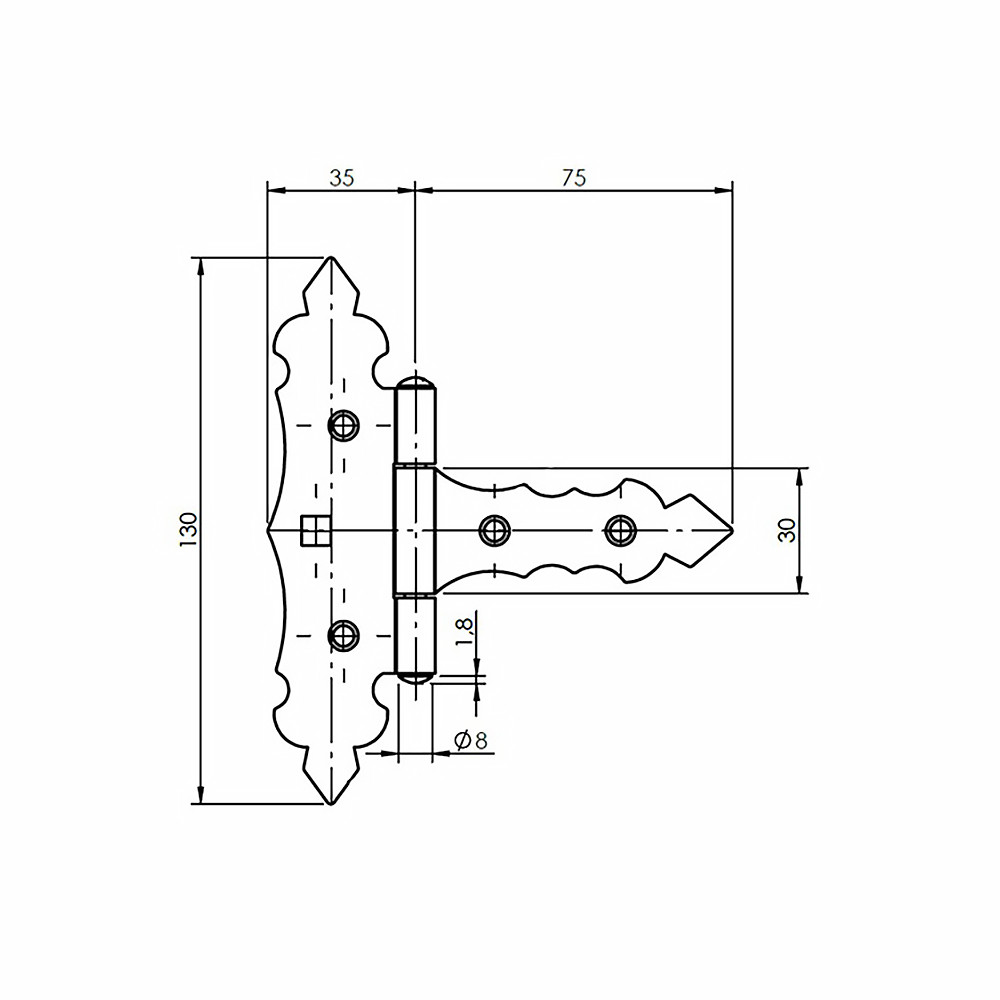 Alaplemez szélesség: 35 mmPánt szélesség: 75 mmAlaplemez magasság: 130 mmPánt magasság: 30 mmLemezvastagság: 2 mm