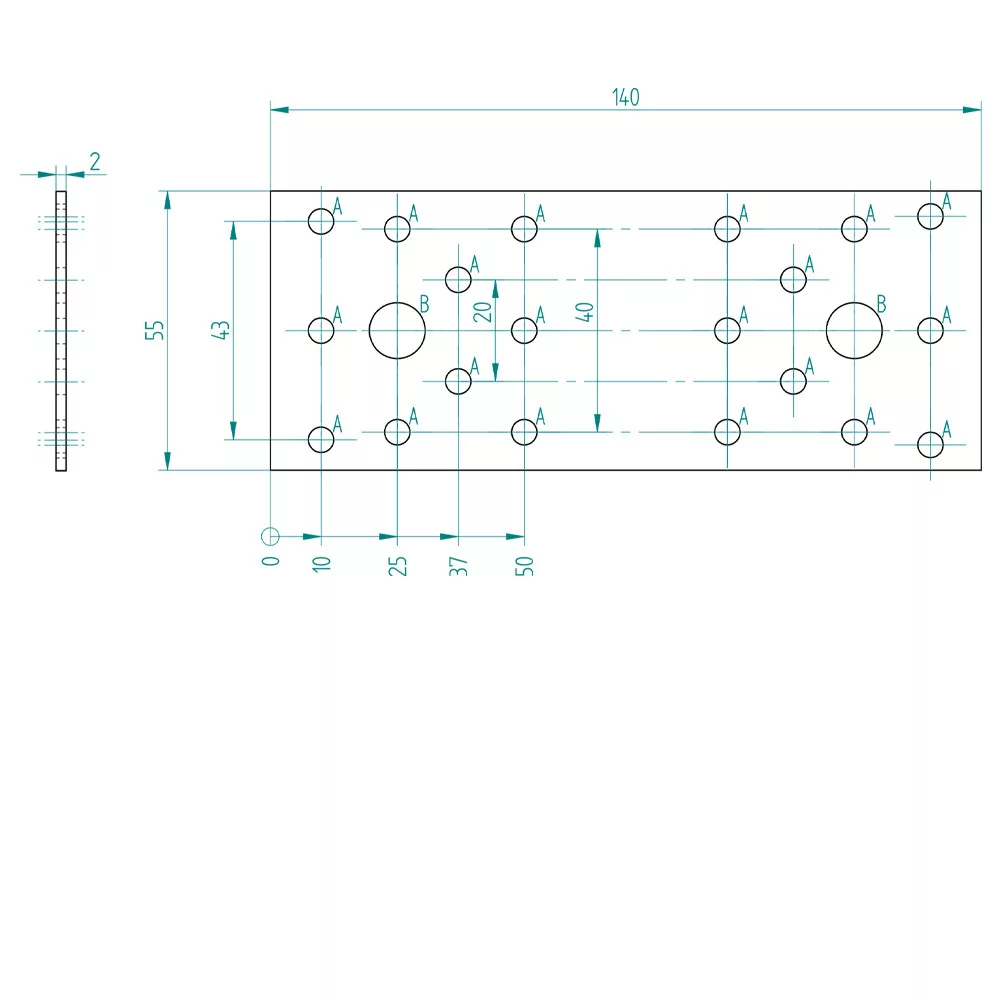 Lapos összekötőlemez kétféle furattal szegekhez és csavarokhozSzélesség: 55 mmHossz: 140 mmLemez vastagság: 2 mmAnyag: HDG DX51D Z275 acélTűzihorganyzott felület