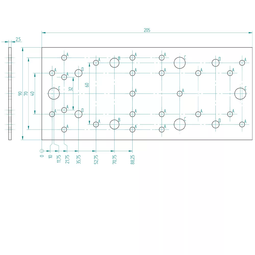 Lapos összekötőlemez négyféle furattal szegekhez és csavarokhoz