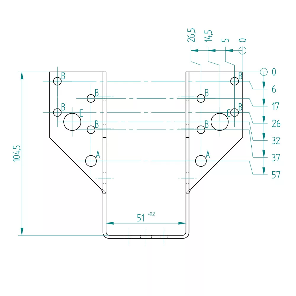 Külső gerendatartó, 51x105 mmKengyel szélesség: 51 mmKengyel magasság: 105 mmAlsó vállrész benyúlása: 70 mmLemezvastagság: 2 mmAnyag: HDG DX51D Z275 acélTűzihorganyzott felületETA 11/0478 minősítés