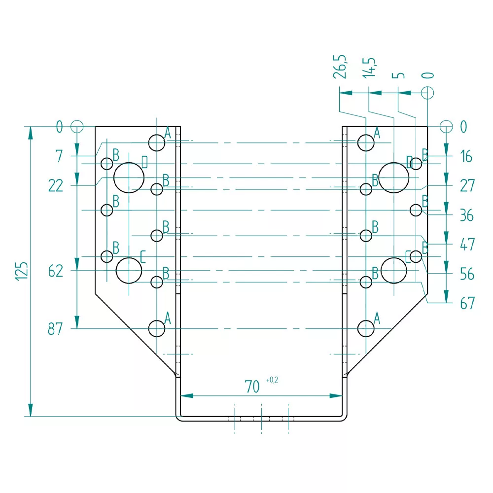 Külső gerendatartó, 70x125 mmKengyel szélesség: 70 mmKengyel magasság: 125 mmAlsó vállrész benyúlása: 70 mmLemezvastagság: 2 mmAnyag: HDG DX51D Z275 acélTűzihorganyzott felületETA 11/0478 minősítés