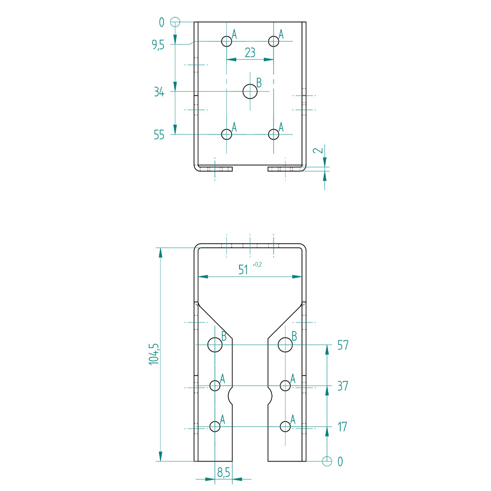 Belső gerendatartó, 51x105 mmKengyel szélesség: 51 mmKengyel magasság: 105 mmAlsó vállrész benyúlása: 70 mmLemezvastagság: 2 mmAnyag: HDG DX51D Z275 acélTűzihorganyzott felületETA 11/0478 minősítés