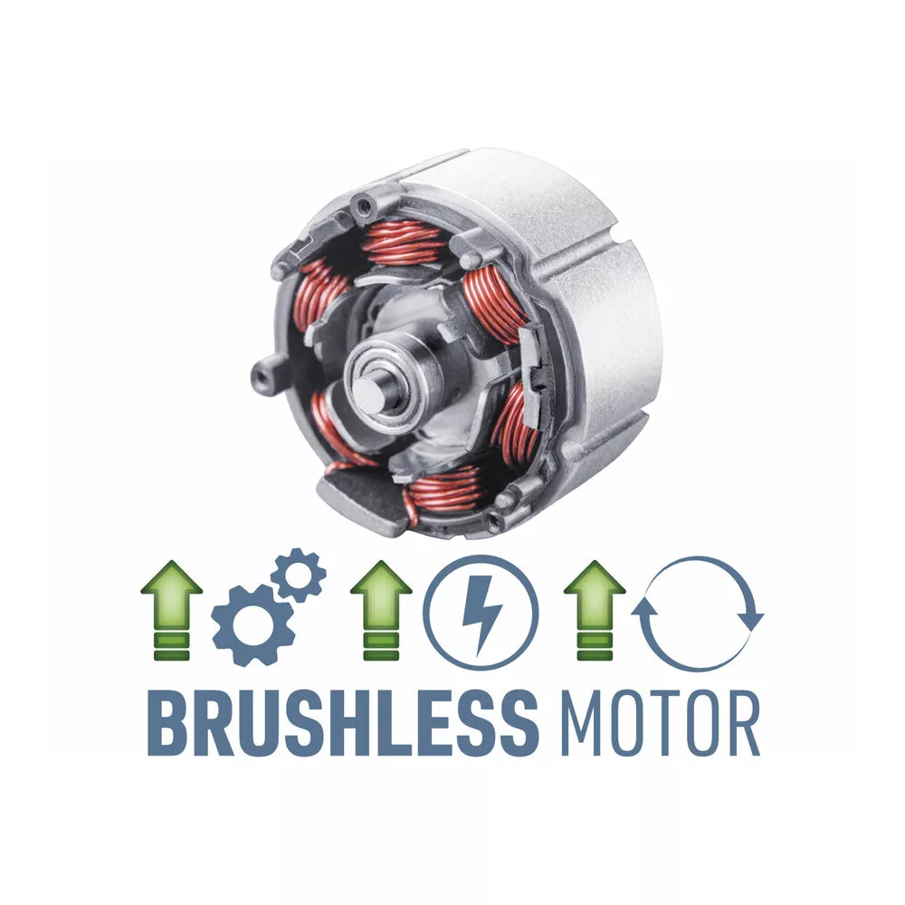 A modern „BRUSHLESS” (szénkefe nélküli) motor biztosítja a nagyobb teljesítmény leadást, miközben kevesebb energiát használ fel mint a szénkefés motor, az akkumulátorral több munka végezhető el, illetve az ilyen motor élettartama is hosszabb.