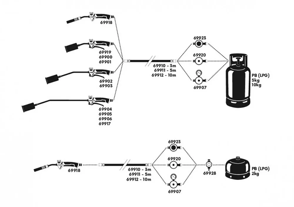 A tömlő mindkét oldalán egy G3/8" csatlakozással van ellátva az égőhöz való csatlakozáshoz és egy nyomáscsökkentő szelepen keresztül a palackhoz - lásd az ábrát.