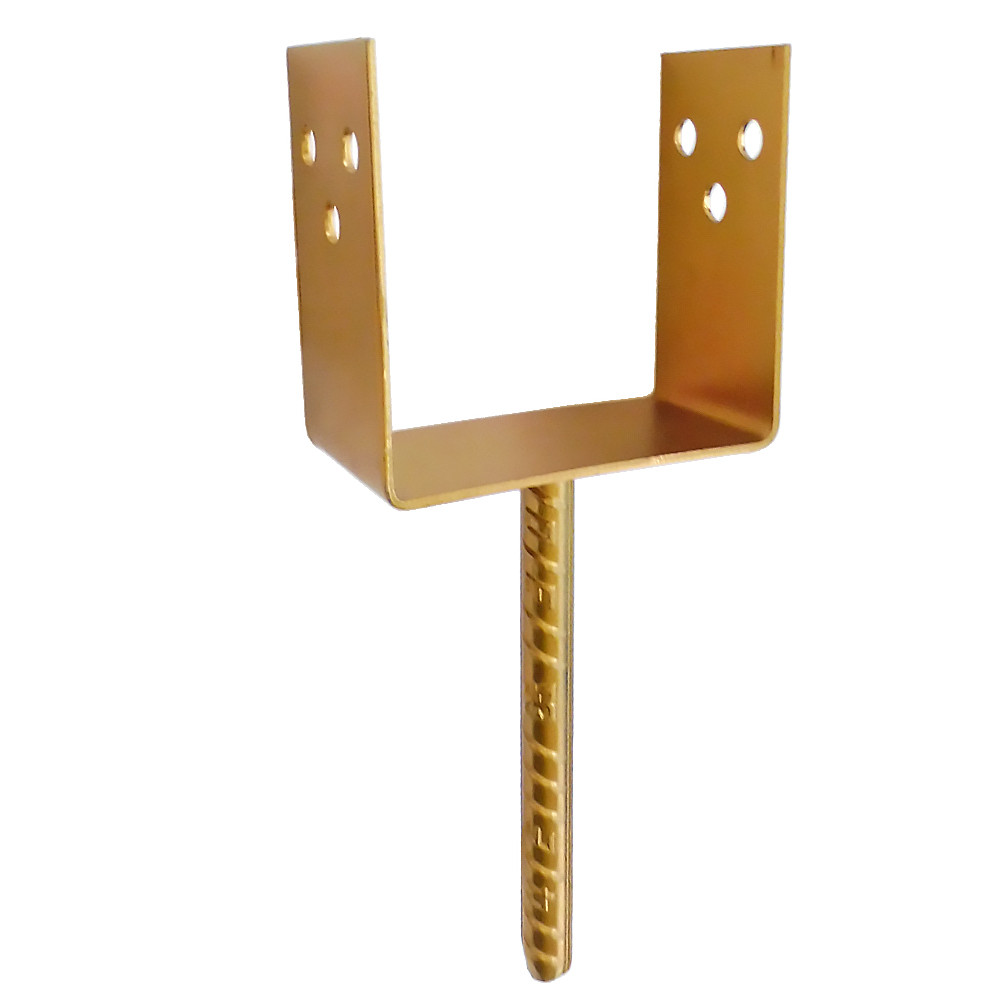 Betonozható oszloptalp kengyellelSárgára horganyzottKengyel szélesség: 80 mmSzár átmérő: 16 mmSzárhossz: 170 mmFurat átmérő: 12 mmLemez vastagság: 3 mm