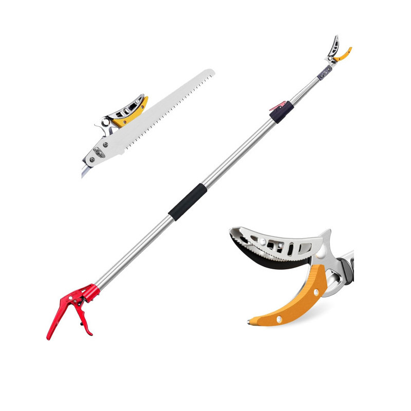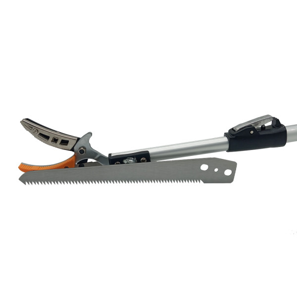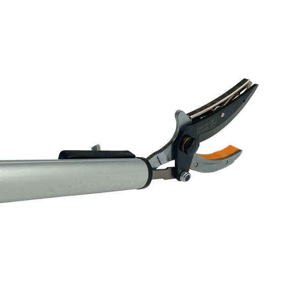 Magassági mellévágó metszőolló tapadásmentes pengével, műanyag fogantyúval és teleszkópos alumínium nyéllel ellátva.A könnyen felszerelhető pengével ágfűrészként is használható.