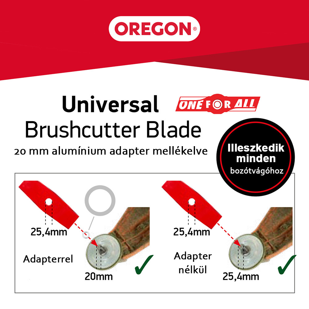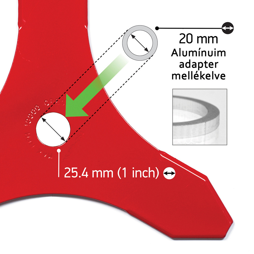 25,4 mm furattal illetve adapterrel szűkíthető 20 mm-re, ezáltal szinte az összes bozótvágóval használható