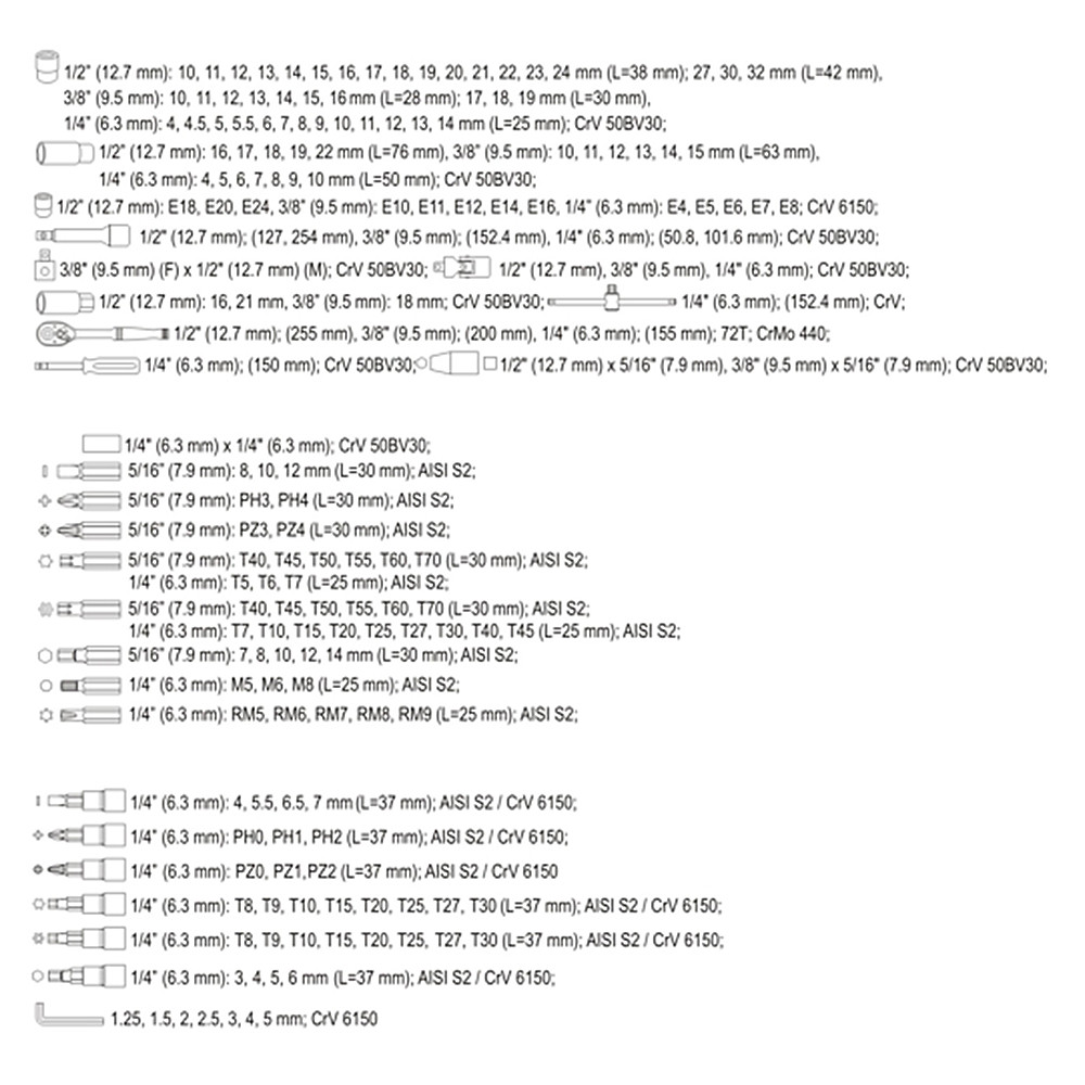 Professzionális szerszámkészlet, amelyet speciális autószerelő és szerelő szolgáltatások igényeihez fejlesztettek ki. A dugókulcsok és a feltét hajtása tartós, CRV 50BV3 szerszám-vanádium acélból készült. A feltéteket mátrix módszerrel készítették, és az edzési folyamat előtt precíz szerelvényekkel és vezérlőeszközökkel kalibrálták őket. A feltétek AS-Drive rendszerrel vannak felszerelve, amely 25%-kal növeli a maximális nyomatékot.