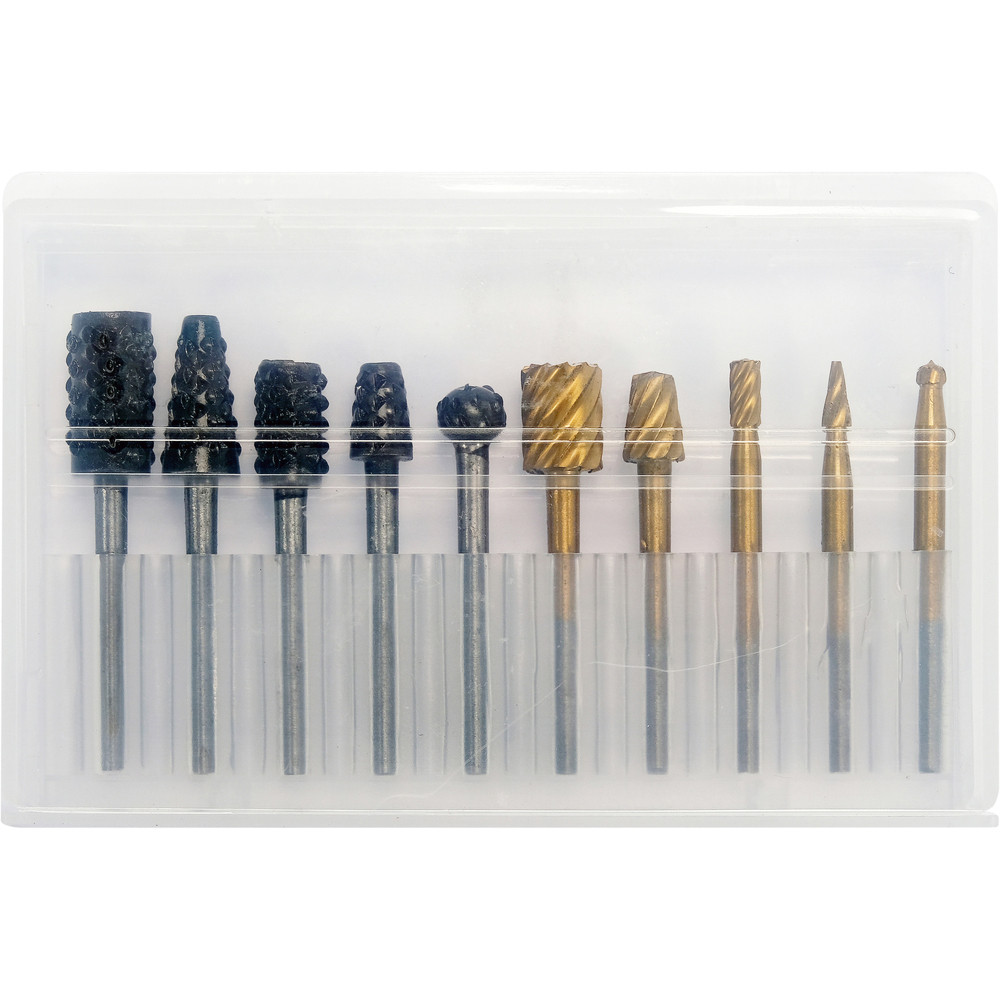 A készletben csavart élű és ráspoly kialakítású hengeres, gömb és kúpos marófejek találhatók