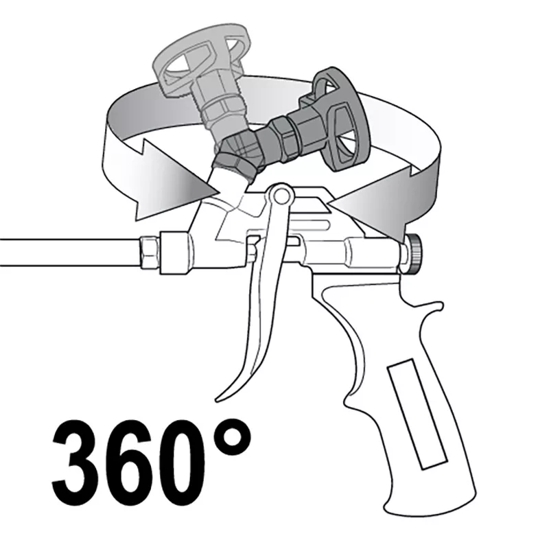 Poliuretánhab felhordásához tervezett pisztoly állítható habtartóval. A csuklósan mozgatható kosár lehetővé teszi, hogy a tartály bármilyen szögben elhelyezhető legyen, így sokkal könnyebbé válik a keverék felhordása, különösen a nehezen hozzáférhető helyeken.