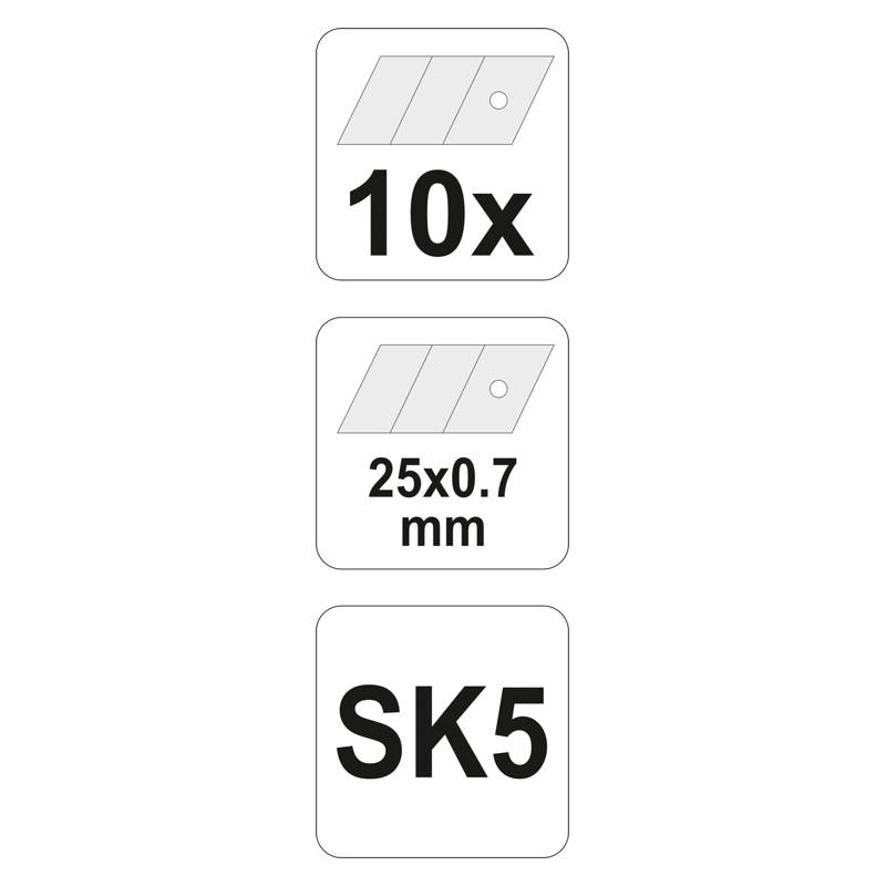 Törhető penge tapétavágókhozSK5 acélbólKeménység: 59-63 HRCSzélesség: 25 mmVastagság: 0,7 mmTörhető szegmensek: 7 db10 darab penge a műanyag tokban