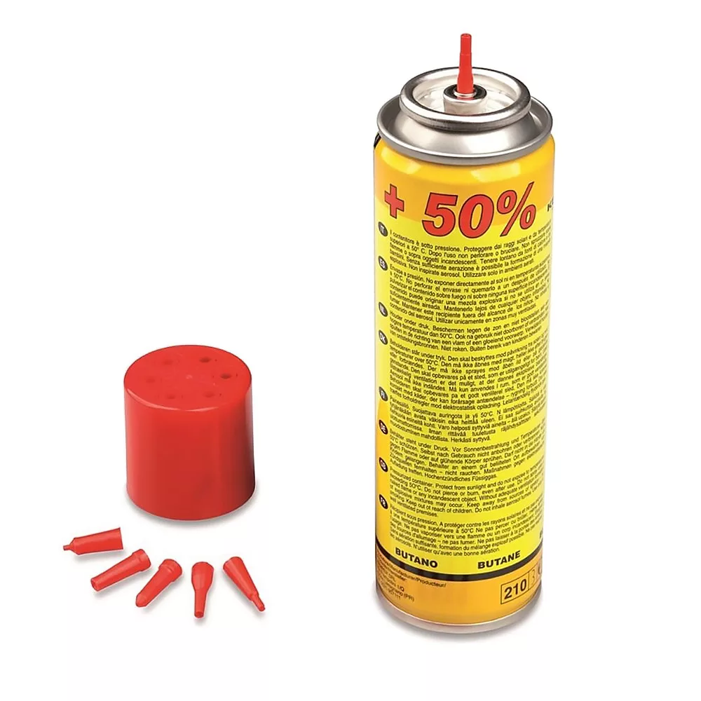 Gáz utántöltő öngyújtóhoz, kis gázégőkhözAeroszol szeleppel, kupakban átalakító csúcsokkal